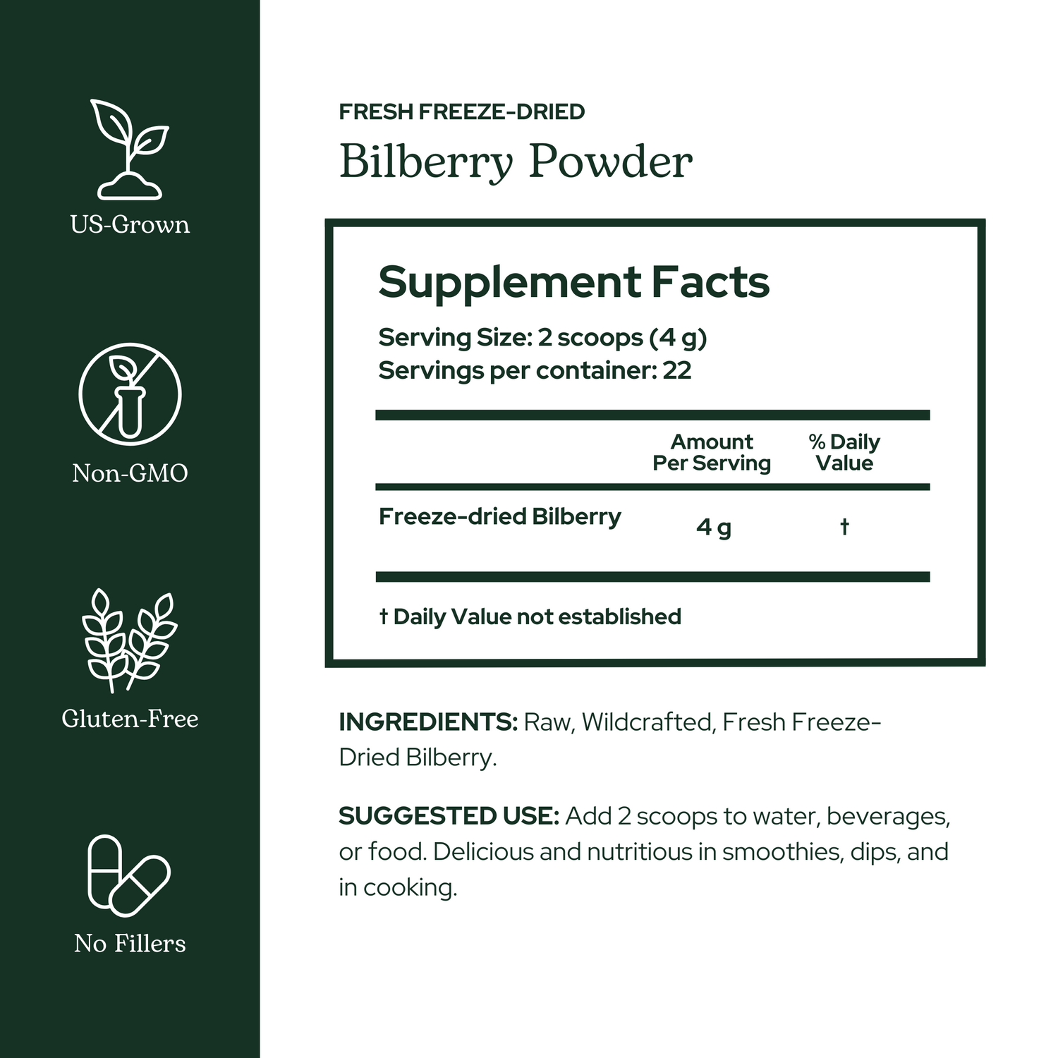 - Two teaspoons of freeze-dried bilberry = 15 teaspoons of fresh bilberries